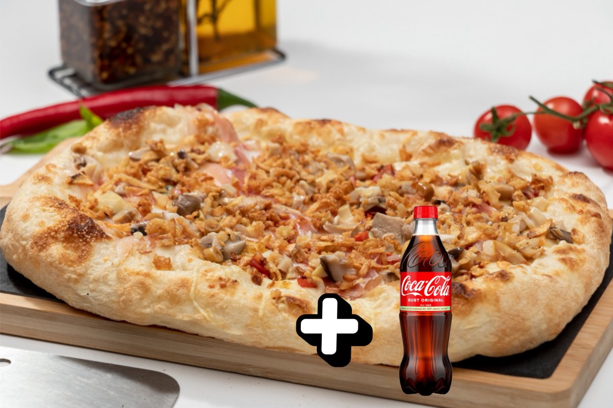 Blat pizza Artizanal, sos de smântână vegetală, mozzarella, parmezan, emmentaler, gorgonzola, spianata piccante, pancetta affumicata, mix ciuperci în ulei, fulgi de ceapă + Coca Cola 500ml