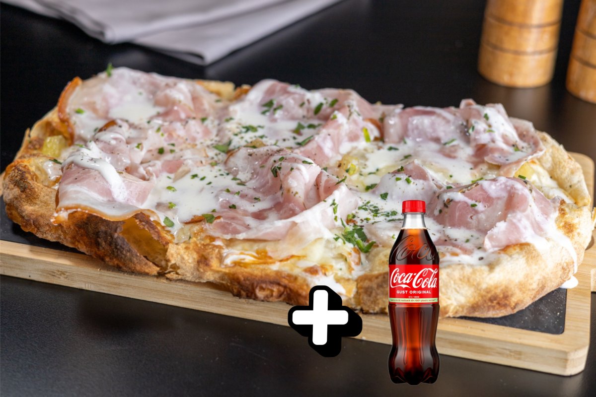 Blat pizza Artizanal, sos de smântână vegetală, mozzarella, cartofi la cuptor , Porchetta ,sos parmezan + Coca Cola 500ml