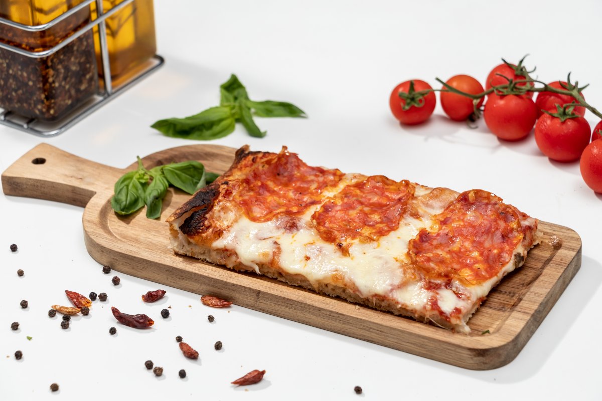 Blat pizza Artizanal, sos de roșii Mutti, mozzarella, spianata romana piccante