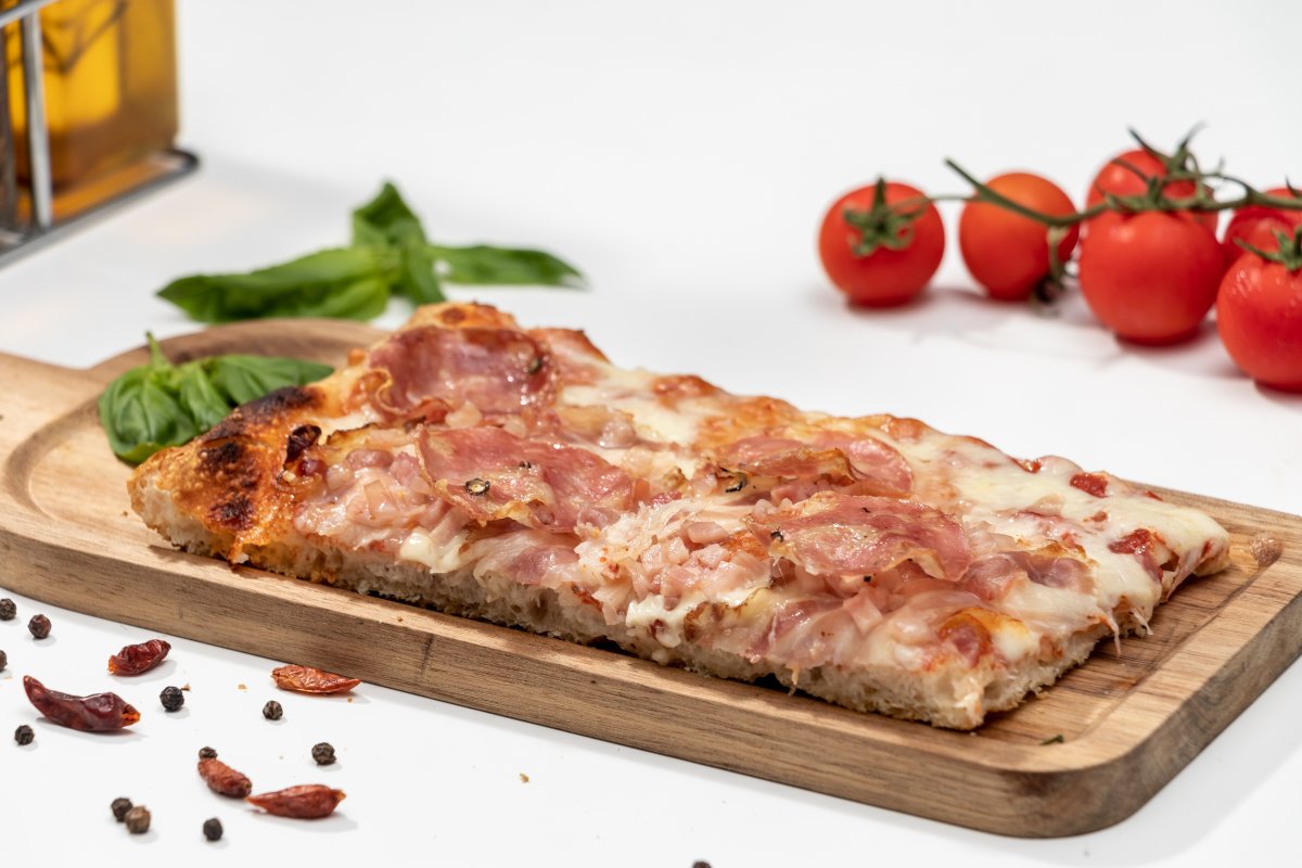 Blat pizza Artizanal, sos de roșii Mutti, mozzarella, prosciutto cotto, salam napoli, pancetta affumicata