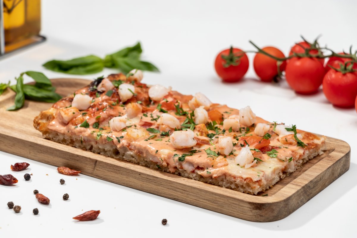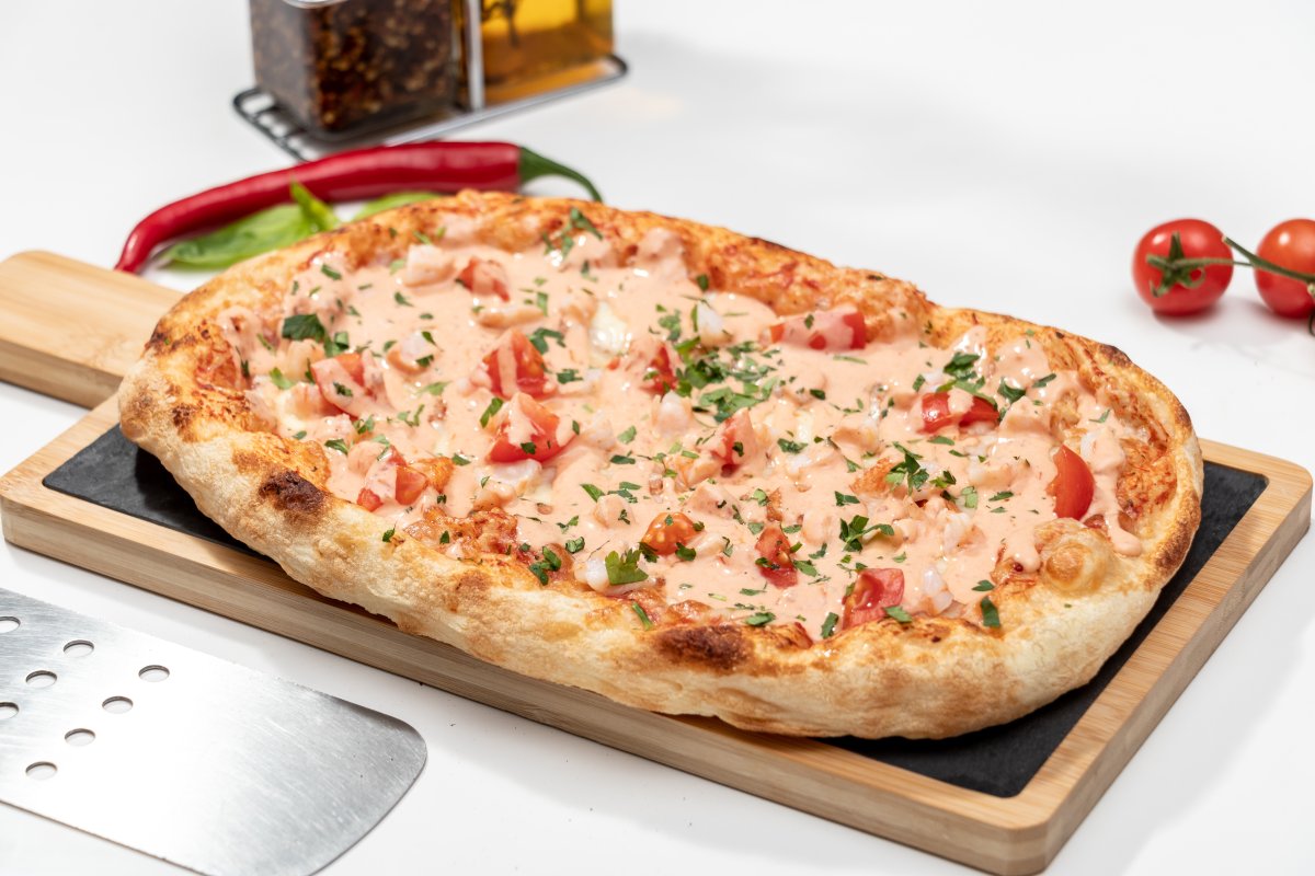 Blat pizza Artizanal, sos de roșii Mutti, mozzarella, creveți, roșii cherry, sos cocktail, pătrunjel proaspăt