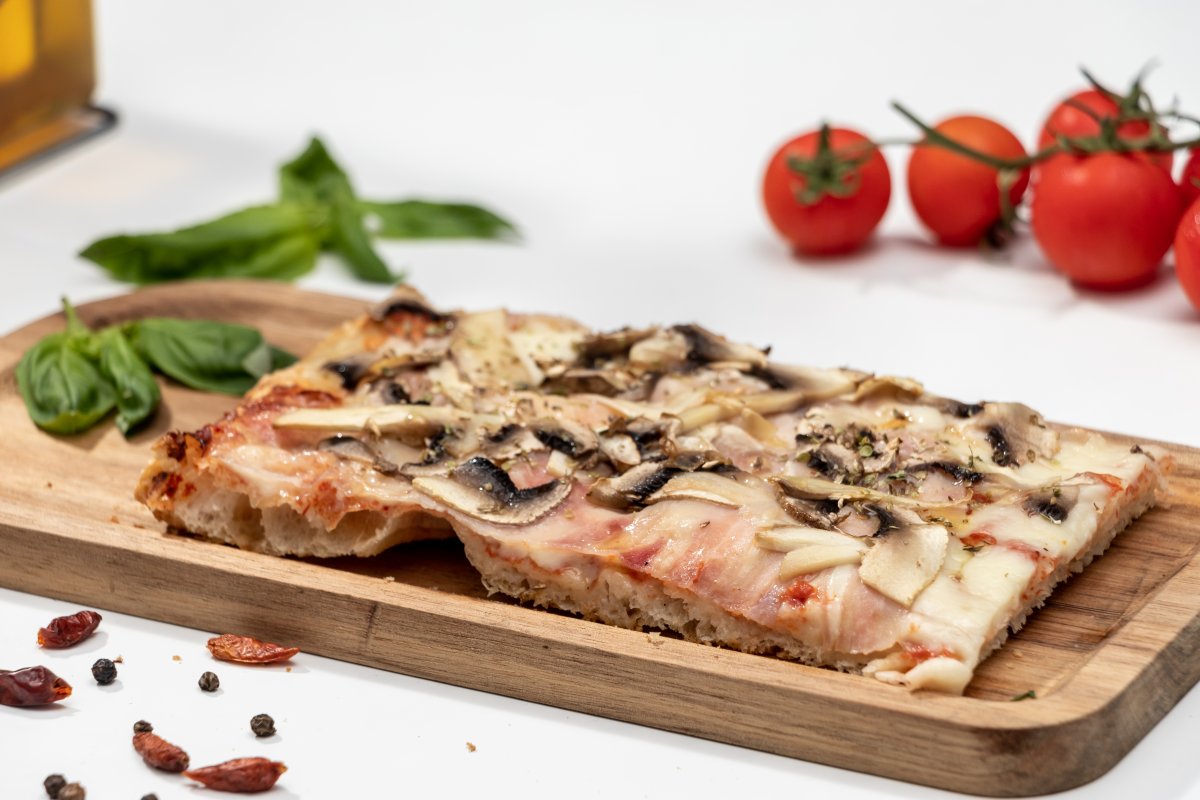 Blat pizza Artizanal, sos de roșii Mutti, mozzarella, prosciutto, cotto, ciuperci champignon, oregano