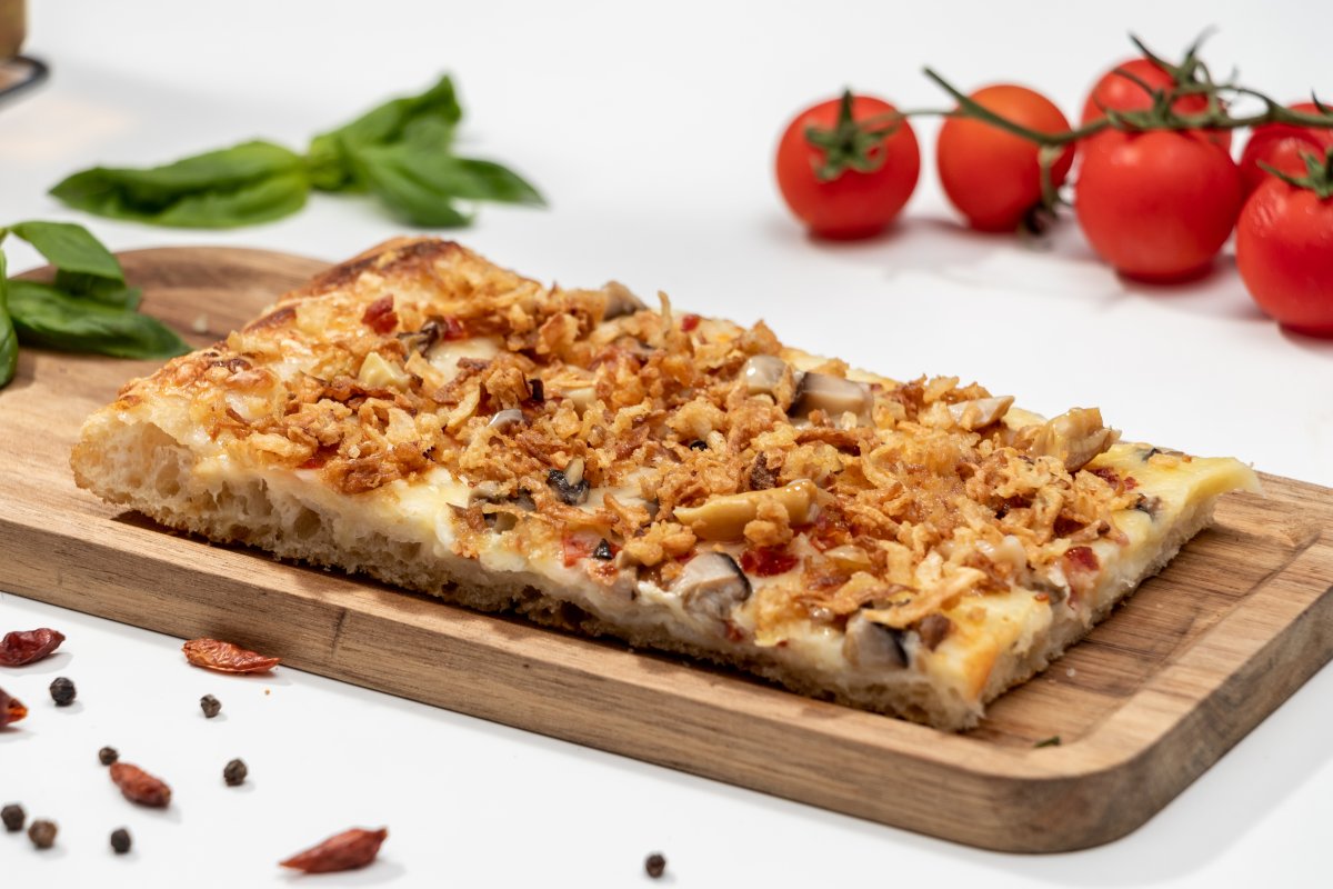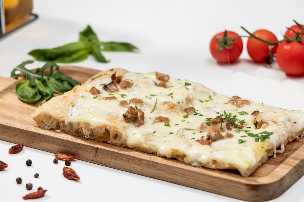 Blat pizza Artizanal, sos de smântână vegetală, mozzarella, parmezan, emmentaler, gorgonzola, spianata piccante, pancetta affumicata, mix ciuperci în ulei, fulgi de ceapă