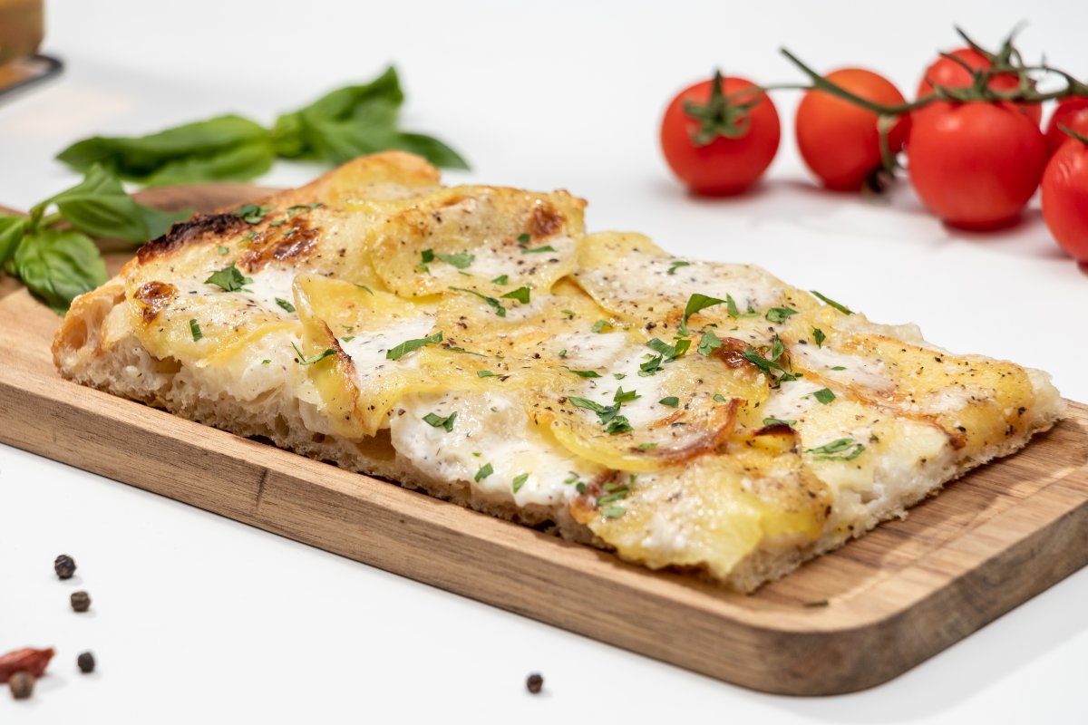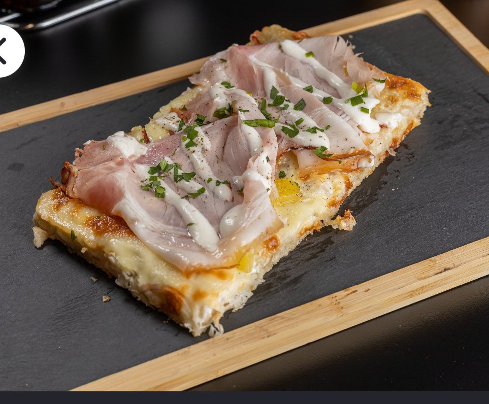 Blat pizza Artizanal, sos de smântână vegetală, mozzarella, cartofi copți, porchetta, sos de parmezan, pătrunjel