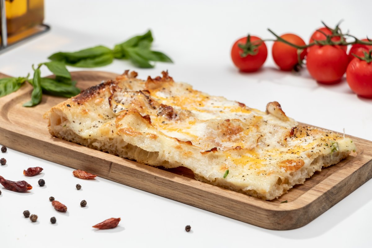 Blat pizza Artizanal, sos de smântână vegetală, mozzarella, guanciale, cremă de mascarpone, cremă de gălbenuș de ou, pecorino romano