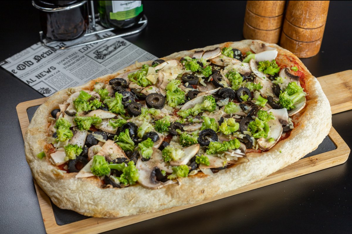 Blat pizza Artizanal, sos de roșii Mutti, ciuperci champignon, anghinare,măsline, broccoli, oregano, busuioc
