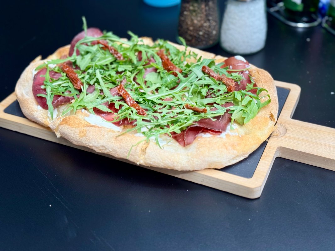 Blat pizza artizanal, cremă de brânză, bresaola , rucola , roșii uscate , ulei cu trufe