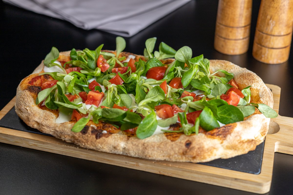 Blat pizza artizanal, sos roșii Mutti, brânză straciatella , salată Valeriana, roșii cherry