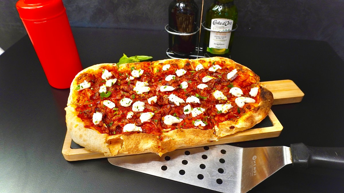 Blat pizza Artizanal, sos de roșii Mutti,guanciale crocant , cremă ricotta cu pecorino, pieper