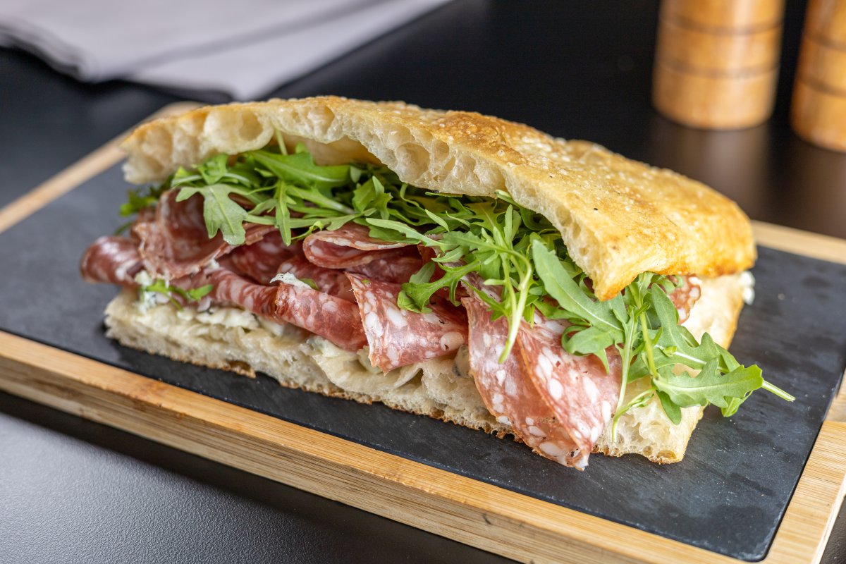 Focaccia Artizanală , Salame milano, Gorgonzola, Rosii, Rucola 320g