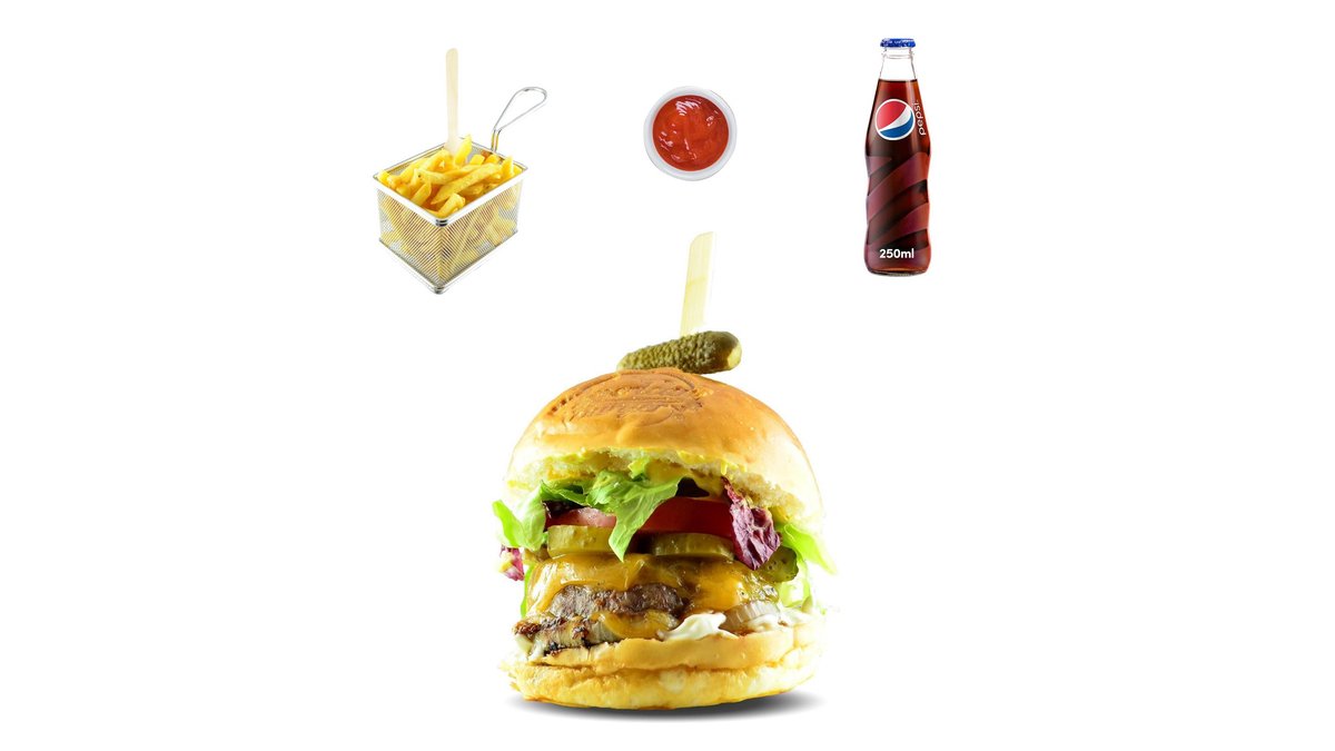 Carne de vită angus 130 g, brânză cheddar 10, salată, castraveți murați, roșie, muștar, maioneză, chifla burger tip brioche 70 g (250 g) / cartofi prajiti (150 g) / sos la alegere