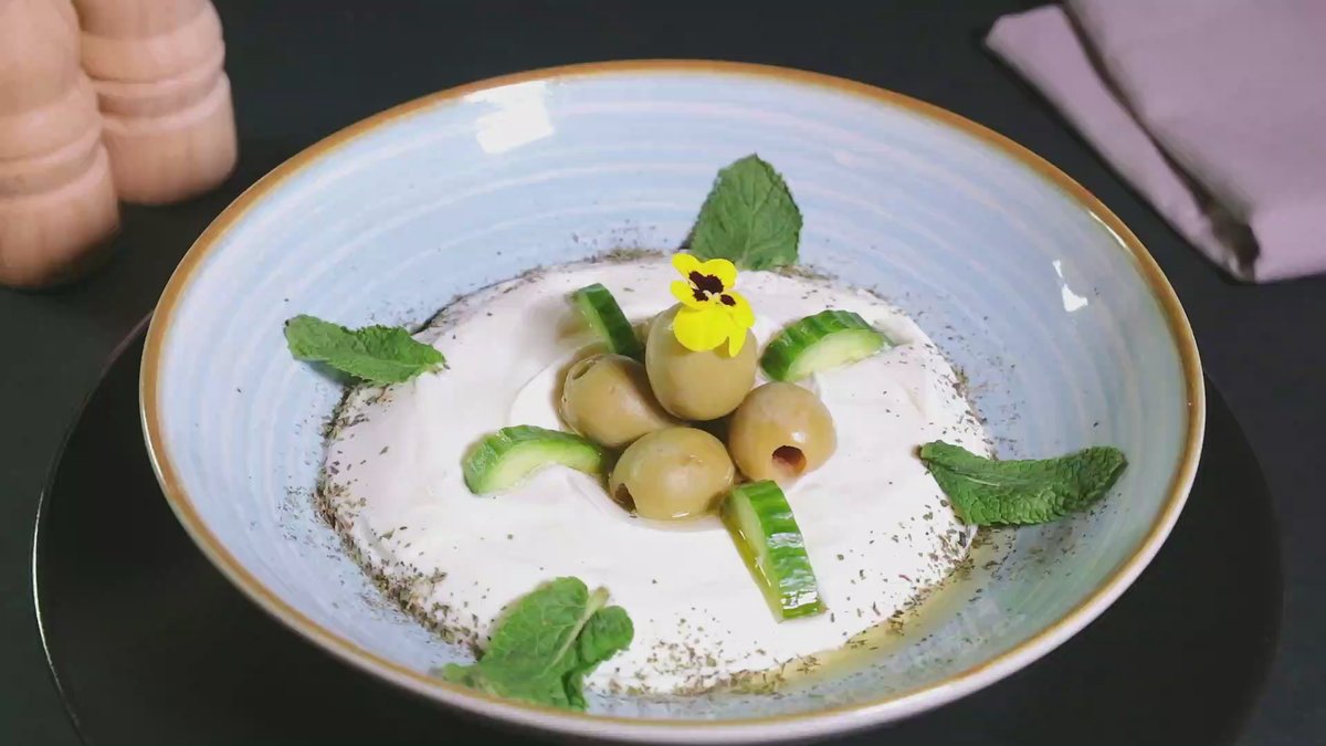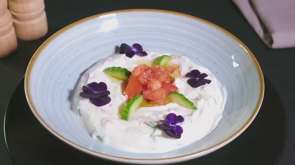 Crema de iaurt, menta, usturoi, masline, rosii, ardei gras, ardei gras rosu, si castravete Valori nutritionale 250 g Lipide g: 11.50 Acizi grasi saturati g 8.05 Glucide g: 10.58 Proteine g: 7.82 Sare g:5.00 kcal:184.00 Alergeni lactoza crema de iaurt