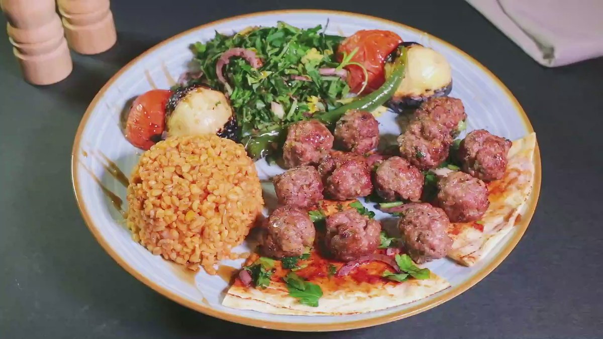 Carne mixt berbecuț și vită, frigărui de Mușchi de vită, frigărui de pui, roșii, ceapă, ardei iute, bulgur, lipie Mixed mutton & beef, beef tenderloin skewers, chicken skewers, tomatoes, onion, grilled pepper, bulgur, lebanese bread kcal:1022.89