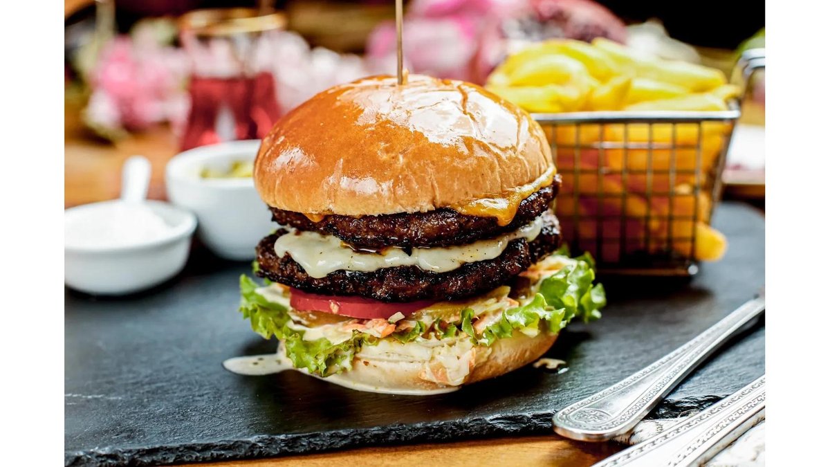 Carne de vită (2 x 150 g), chiflă susan și mac, salată, roșii, castraveți murați, sos de usturoi, sos ketchup Heinz, brânză la alegere (cedar, mozzarella, cașcaval), cartofi prăjiți