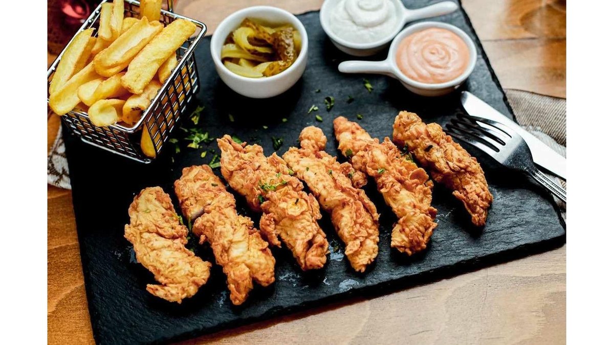 Mușchiuleț de pui, cartofi prăjiți, castraveți murați, salate, sos la alegere Chicken muscle, french fries, pickles, sauce of your choice