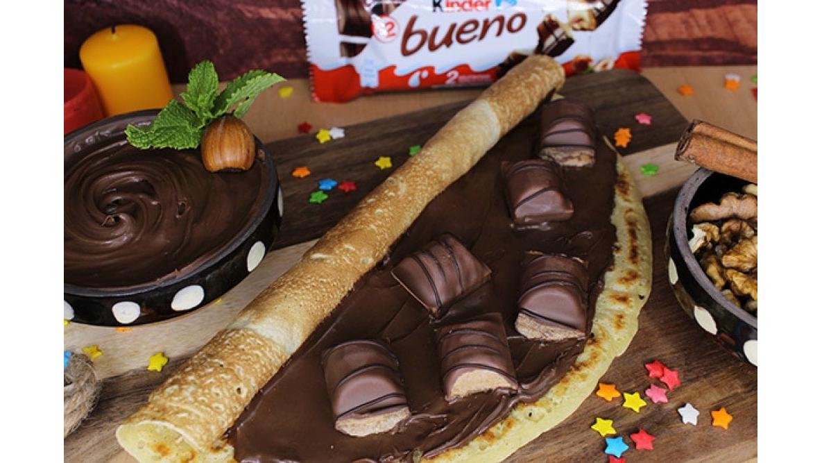 Clatita pufoasa si aromata, coapta pe plita, umpluta cu crema de alune Nutella si bucatele de ciocolata Kinder Bueno (230 gr.) Ingrediente foaie clatita: lapte, oua, faina, sare, vanilie.