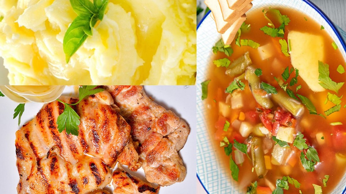 Ciorba de legume, muschiulet de porc la gratar,smantana,sos brun,ciuperci,sare,piper,ulei,piure de cartofi