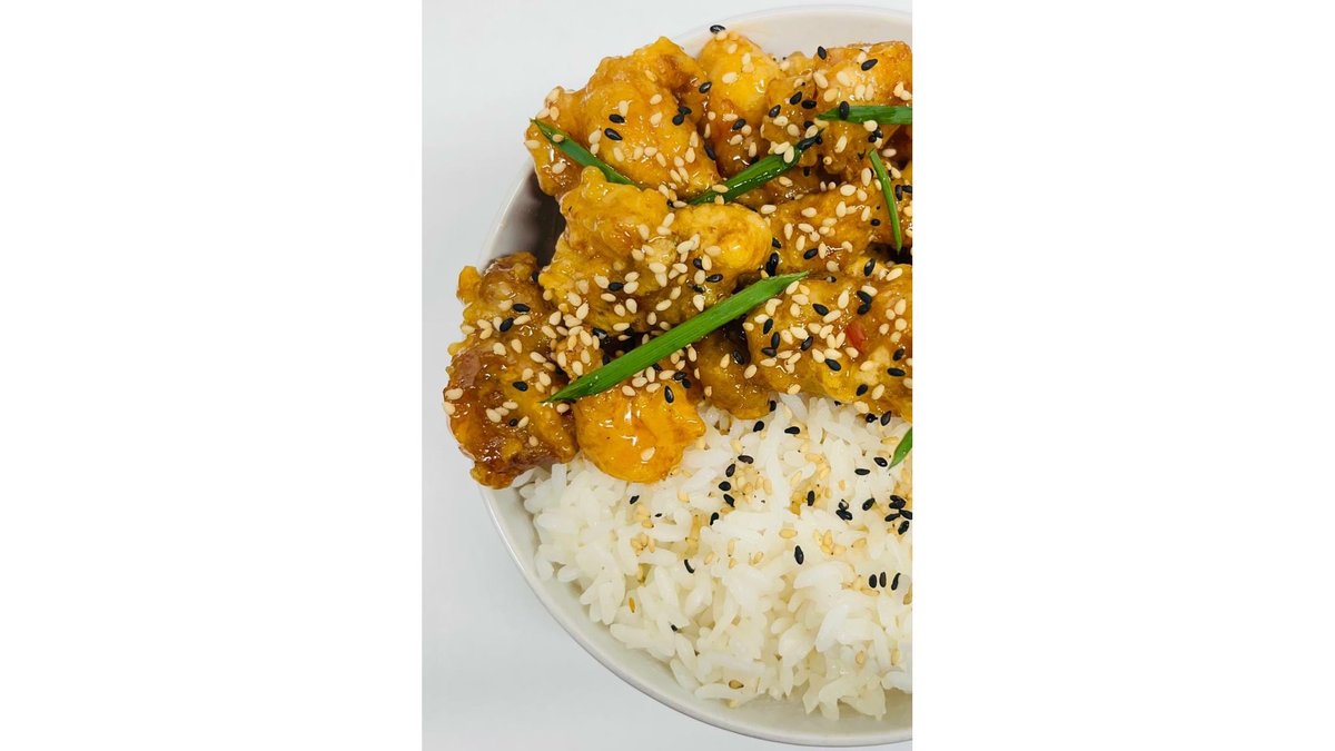 tempura de pui prajit intr-un sos dulce si picant 250 gr cu orez 200 gr