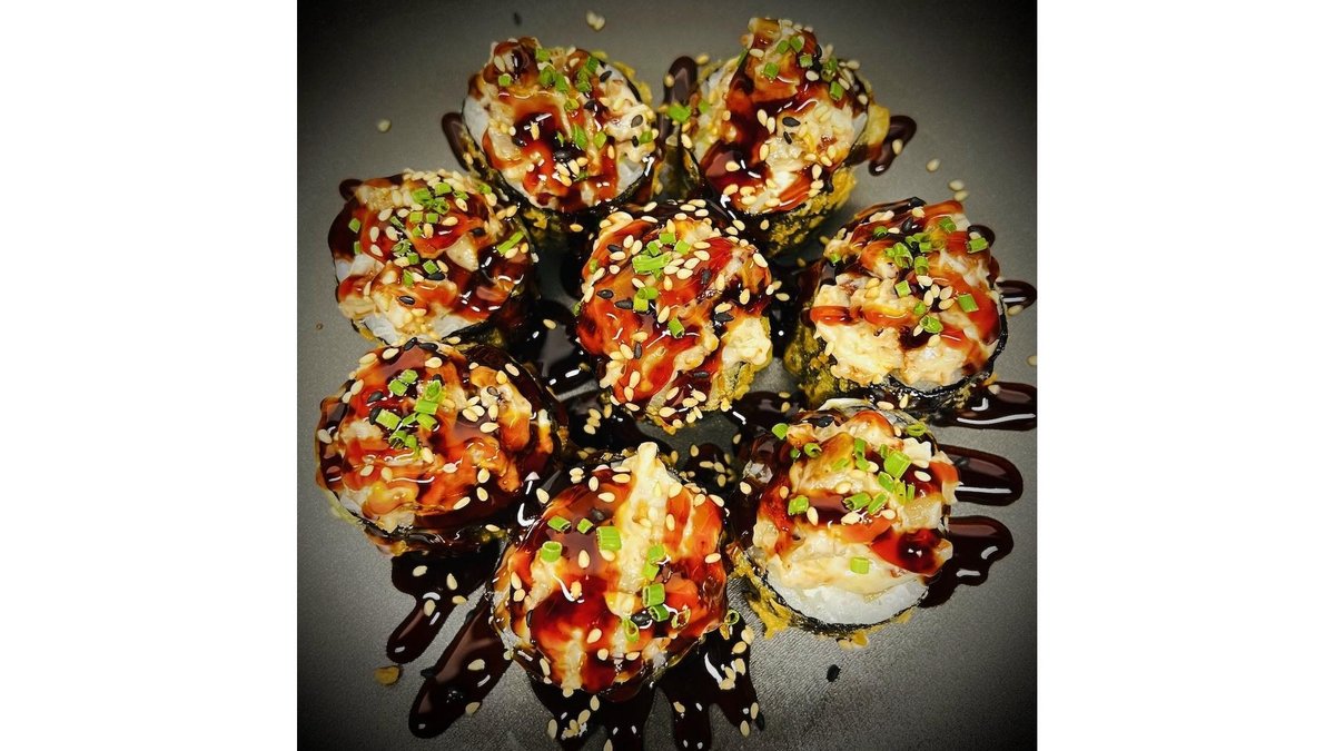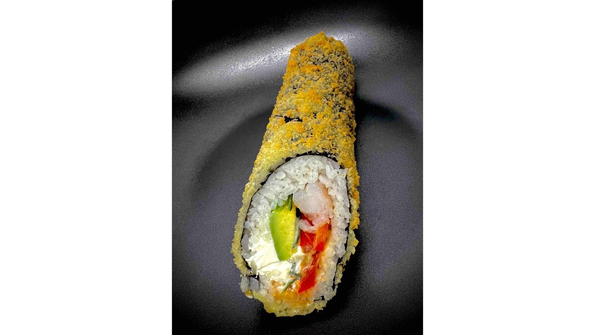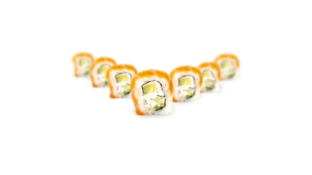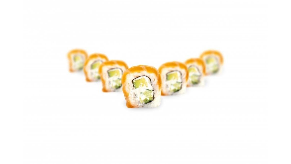 Sushi rice - 120g, cucumber - 50g, fried shrimps - 3pc, creem cheese - 30g, tobico - 10g, spicey sauce - 15g