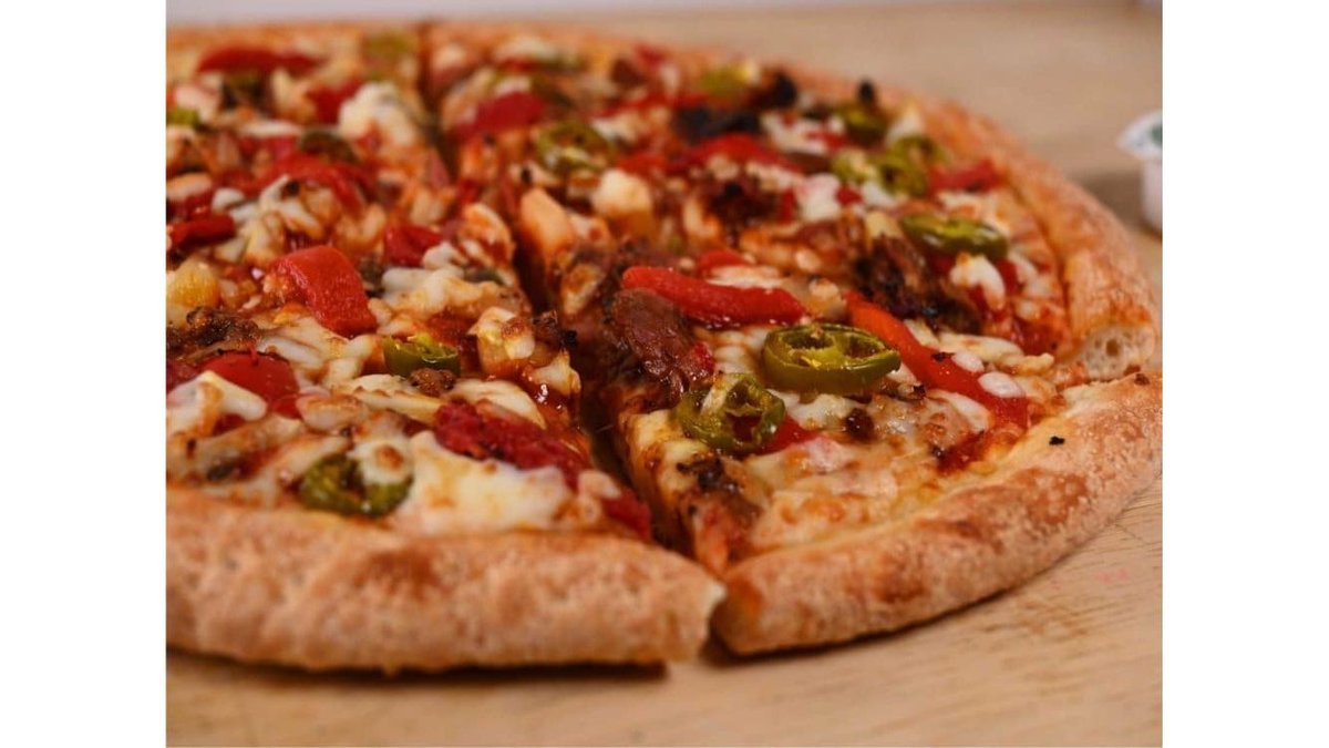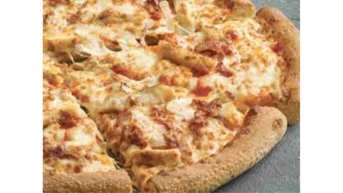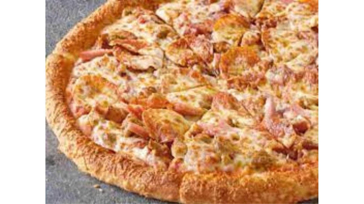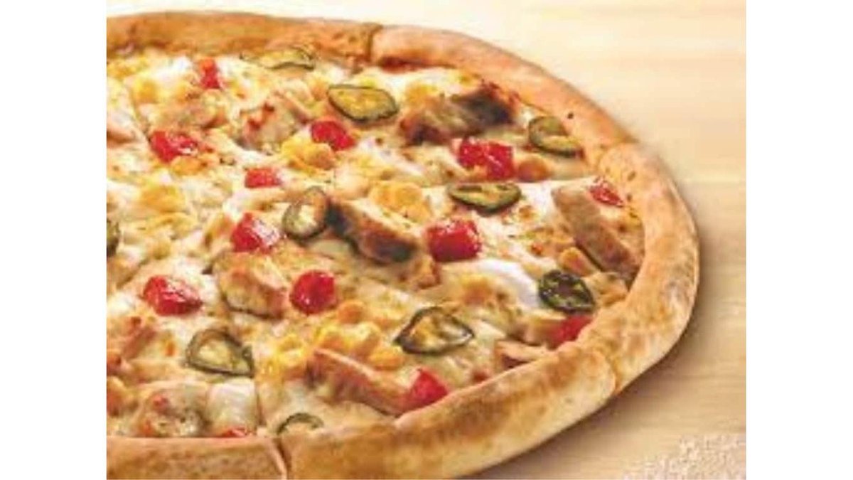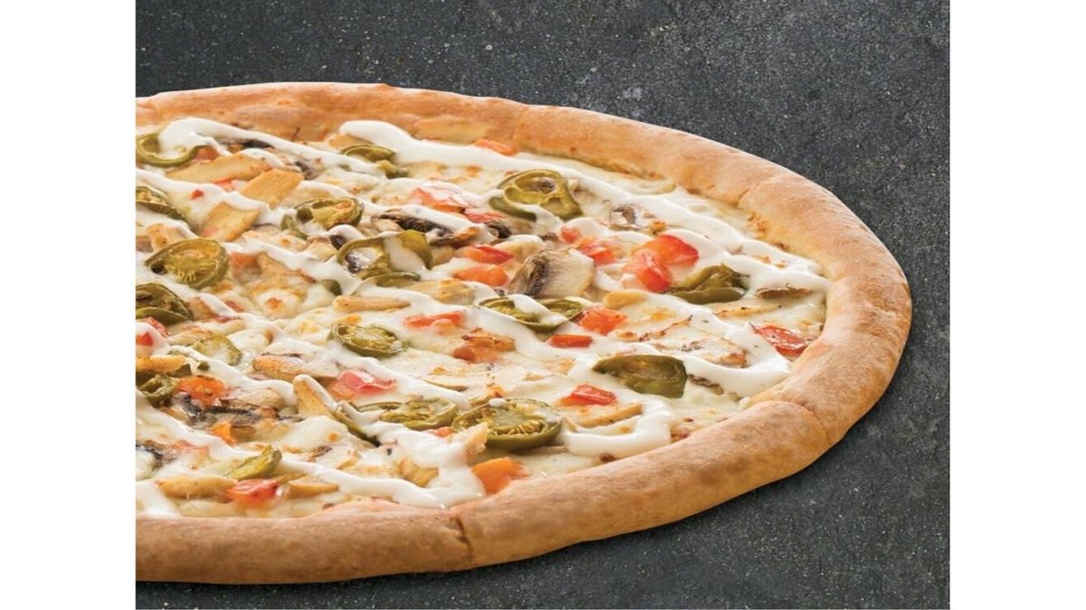 Sos de roșii, mozzarella, usturoi, jalapenos, bucațele de pui, măsline, ceapă