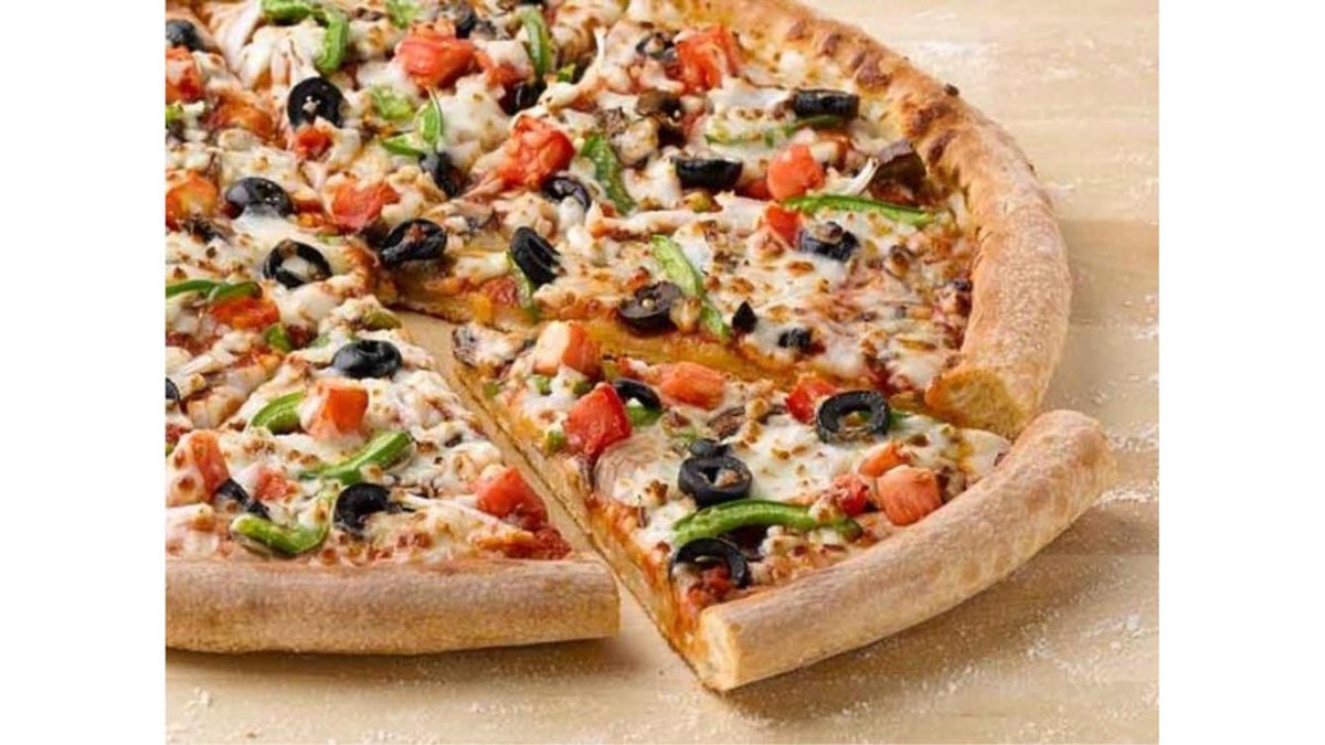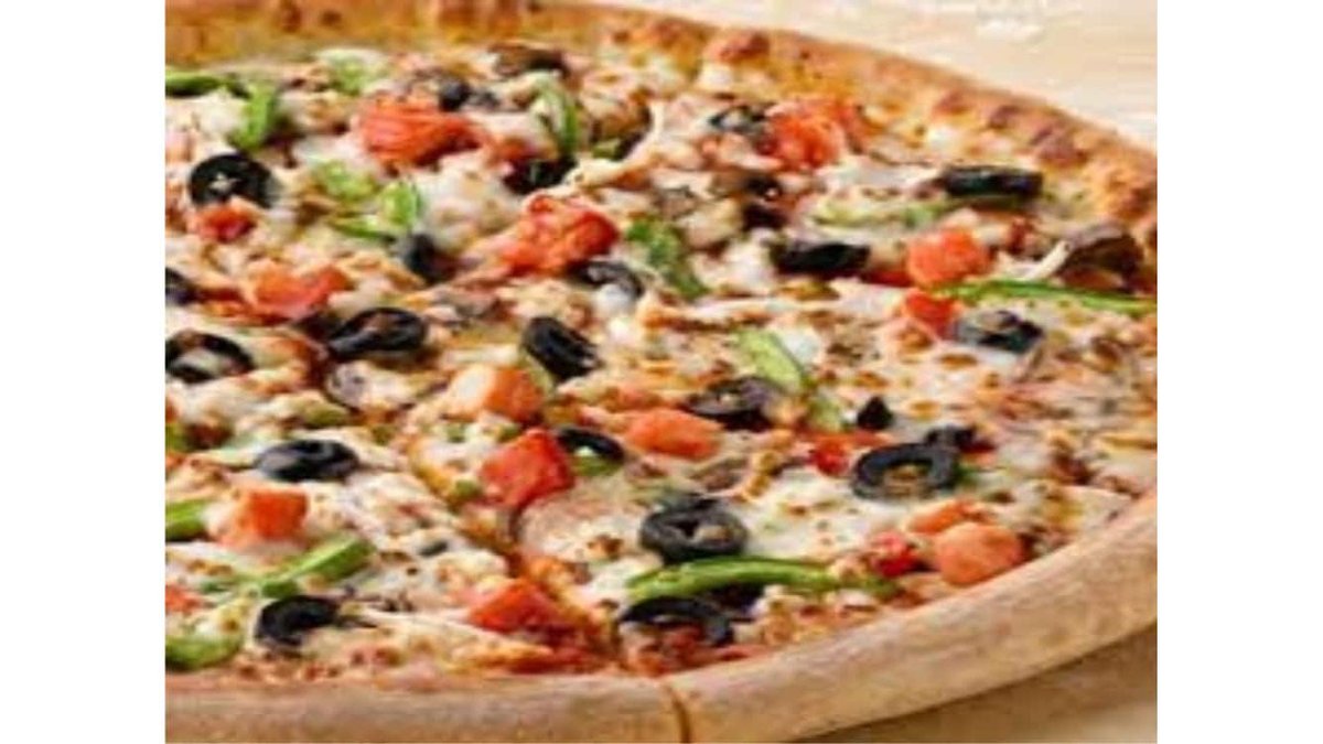 Sos, mozzarella, salam, șuncă, ciuperci, măsline, rosii, porumb, ardei, ceapa
