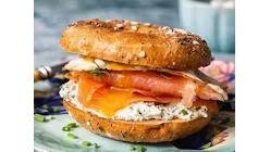 Chifla crocantă, cremă de brânză, somon fume, ceapă roșie și mixt de salată.