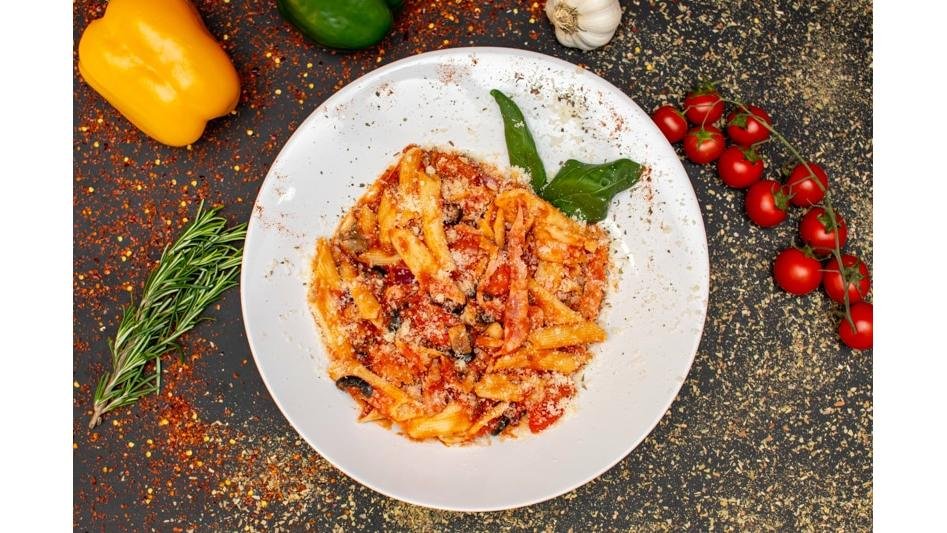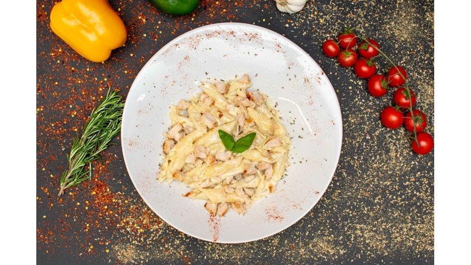 Penne (250g), bacon (100g), șuncă (100g), sos roșu (200ml), parmezan (50g). 700 g