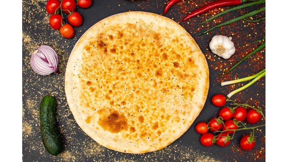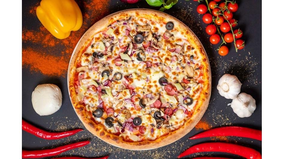 Blat pizza, sos roșii, mozzarella, șuncă, salam, ciuperci, măsline, ardei, porumb. 1240 g