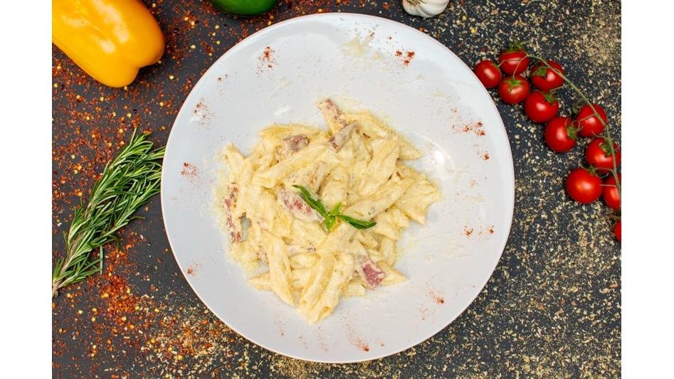 Penne (250g), gran cucina (100ml), bacon (100g), parmezan (50g), ou (60g), sare + piper (10g). 570 g