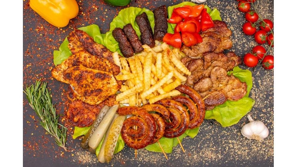 Ceafă (200g), pui (200g), cârnați (200g), mici (240g), cartofi prăjiți (400g), murături (200g), muștar (80g). 1520 g