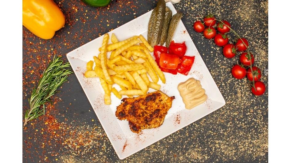 Piept de pui (200g), cartofi prăjiți (200g), murături (100g), pâine la cuptor (260g), maioneză cu usturoi (80g), sare + piper (10g). 850 g