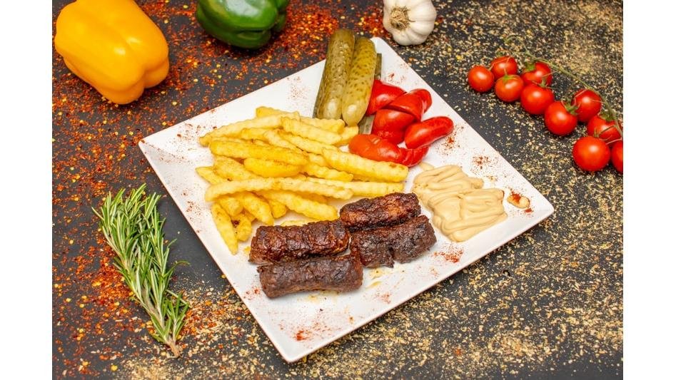 4 mici (240g), cartofi prăjiți (200g), murături (200g), pâine la cuptor (260g), muștar (80g). 980 g