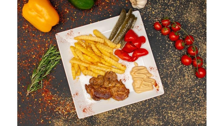 Ceafă porc (200g), cartofi prăjiți (200g), murături (100g), pâine la cuptor (260g), maioneză cu usturoi (80g), sare + piper (10g). 850 g