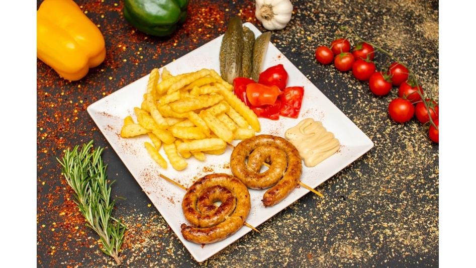 Cârnați (3 buc 200g), cartofi prăjiți (200g), murături (100g), pâine la cuptor (260g), maioneză cu usturoi (80g). 840 g