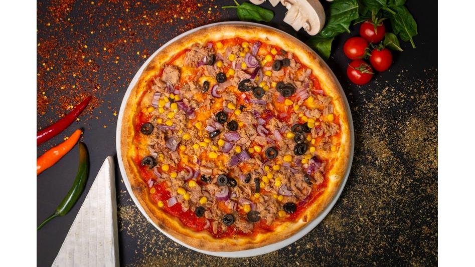 Blat pizza, sos roșii, ton, măsline, porumb, ceapă, lămâie, busuioc, oregano. 1030 g