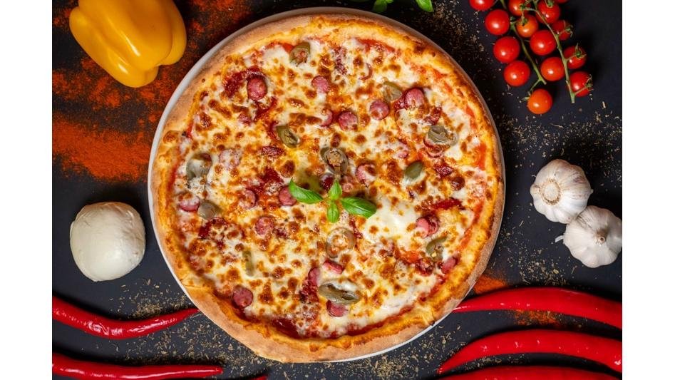 Blat pizza, sos roșii, mozzarella, șuncă, salam, măsline, ciuperci, busuioc, oregano. 1020 g
