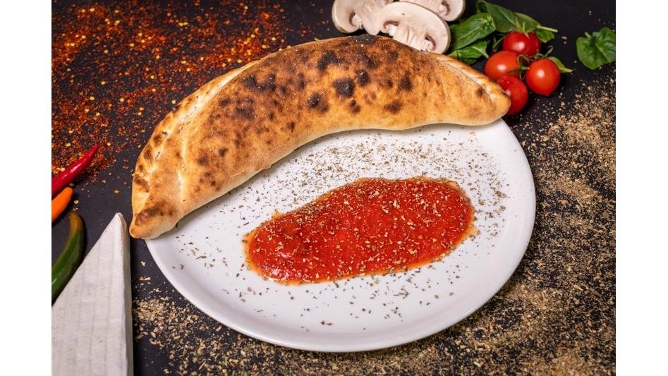Blat pizza, sos roșii, mozzarella, șuncă, ciuperci, măsline, busuioc, oregano. 600 g