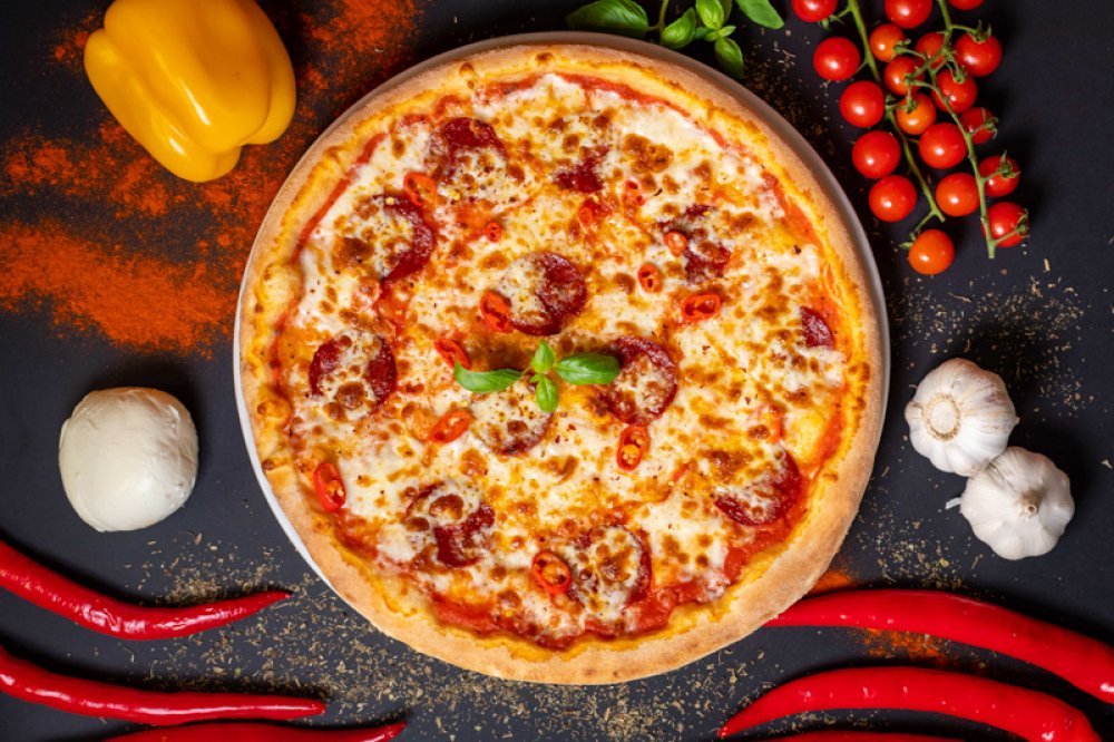 Blat pizza, sos roșii, mozzarella, chorizo, peperoncini. 1000 g