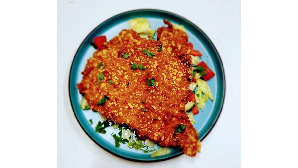 Piept de pui, fulgi de porumb, pesmet, făină, ou, ulei, sare, piper 130 g