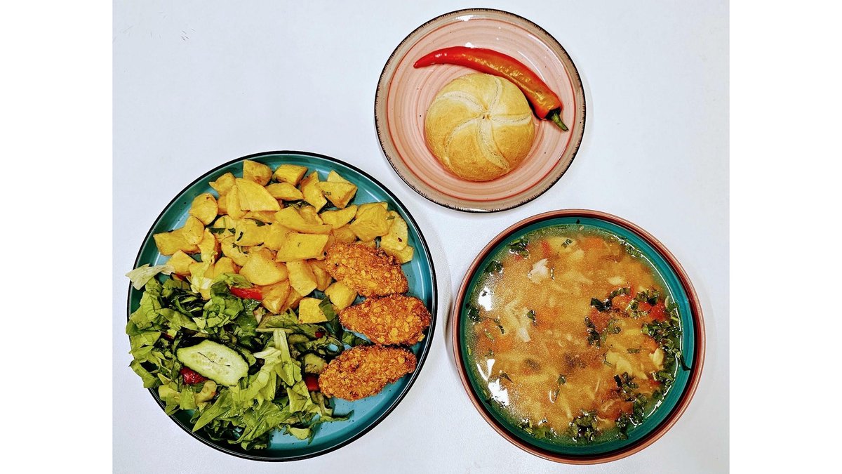 Ciorbă la alegere, aripioare crispy de pui, garnitură (cartofi prăjiți, orez cu legume, piure de cartofi), salată de varză, chiflă 550 g