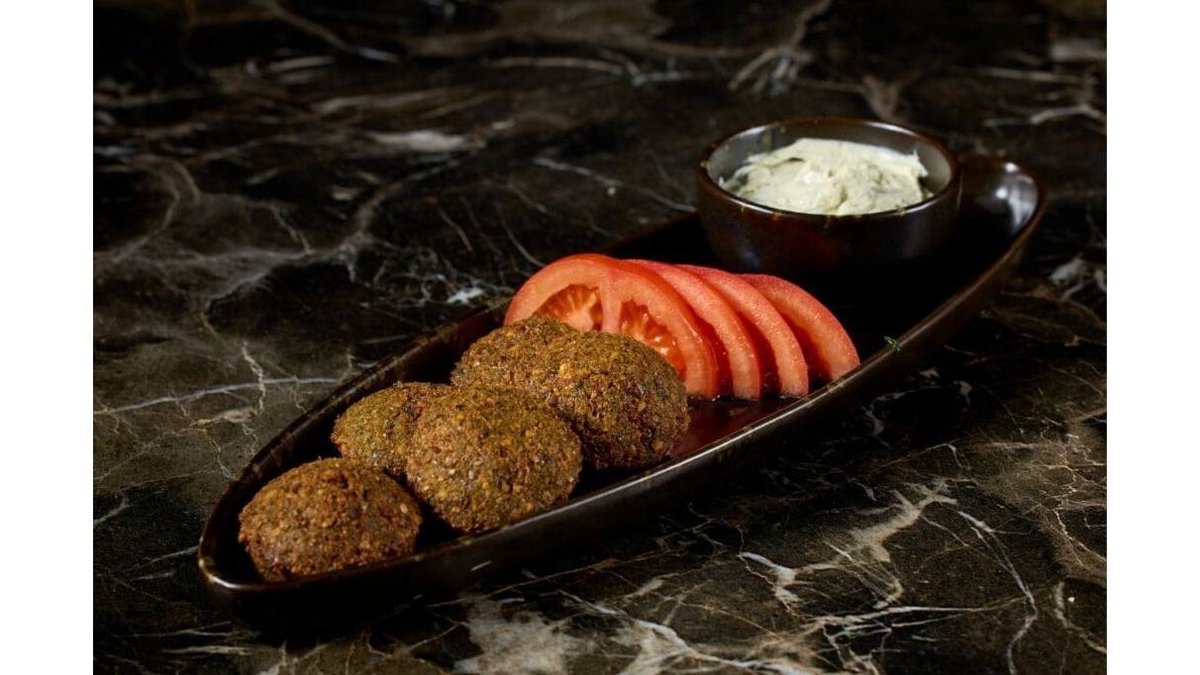 ingrediente: lipie arabeasca prajita, hummus boabe, sos tahini, muguri pin, verdeata, 300 g