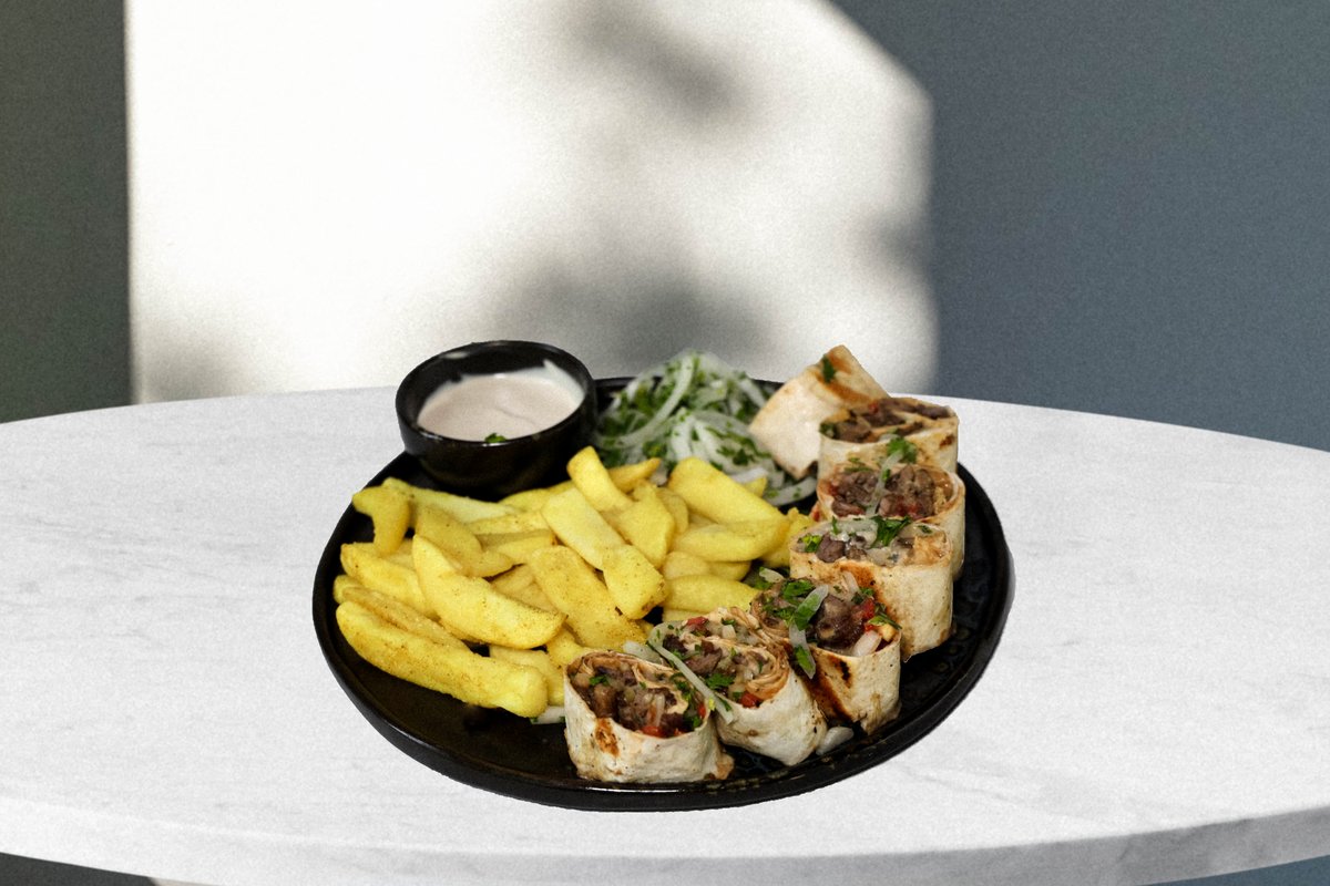 Ingrediente: carne de vita, ceapa, rosie, tahini, cartofi prajiti, patrunjel, sos tahini 200 g