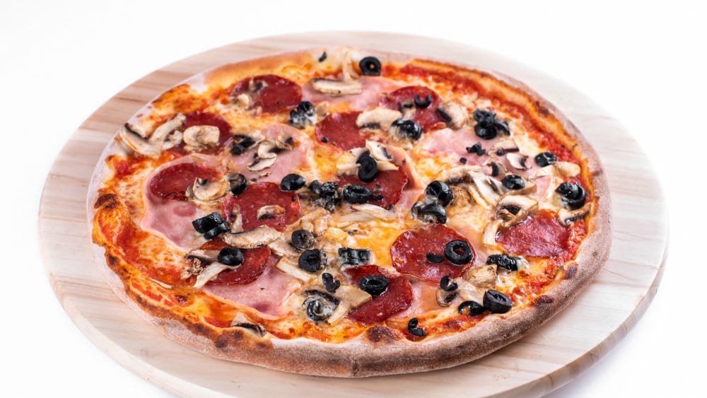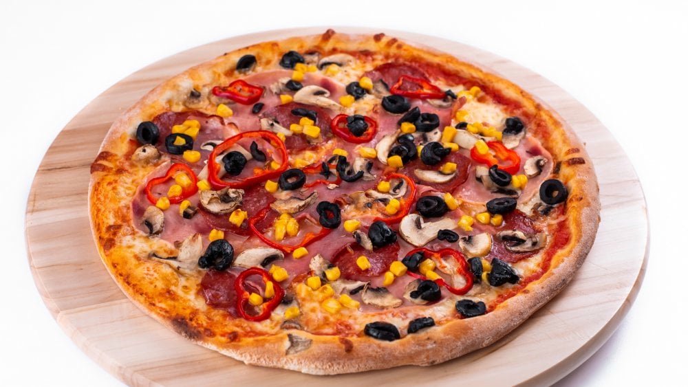 Sos de rosii, mozzarella, sunca, bacon, salam, ciuperci, masline, ardei gras, porumb
