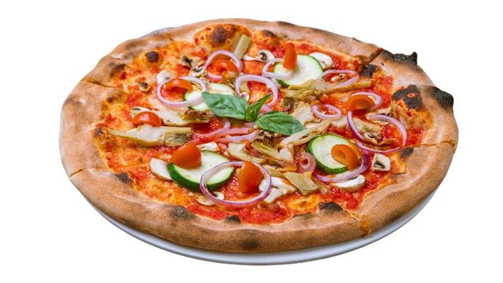 Sos de rosii, mozzarella, ciuperci, ardei kapia, masline, porumb, rosii, ceapa rosie, ceapa verde, patrunjel