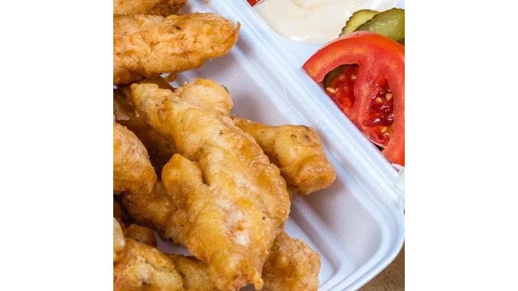 Crispy de pui picant, cartofi prajiti, salata mixta, sos usturoi, bagheta.