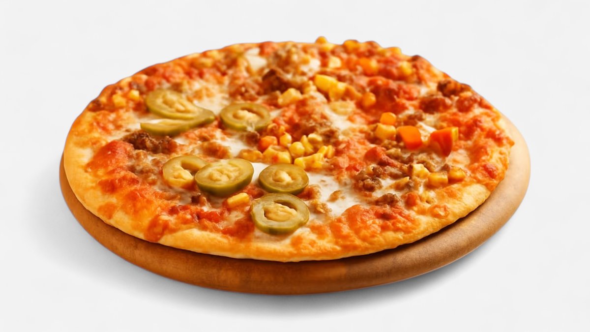 Sos de roșii, pepperoncini, mozzarella, salam, bacon, ceapă, porumb, jalapeno