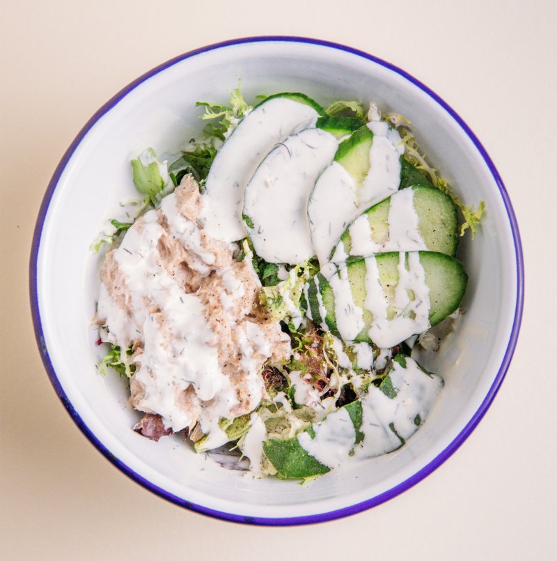 Mix de salată, maioneză cu lămâie și mărar, salată verde, castravete, pastă de ton (ton, ceapă murată, maioneză, muștar, murături, pătrunjel)