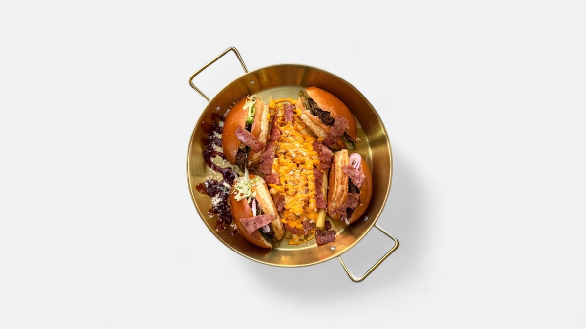 Carne de vită strivită perfect pe plită ,cu chiflă artizanală,cașcaval perfect topit ,sosuri Fresh, cartofi aurii cu Chedar și parmezan