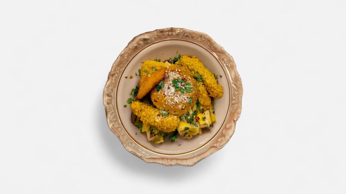 Piet de pui proaspat crispy , cartofi perfect prajiti,salate fresh si sosuri aromante