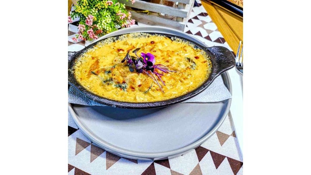Vită tăiată julien, creveți, foi de lasagna, parmezan, ciuperci, baby spanac, ulei picant, roșii cherry - 350g